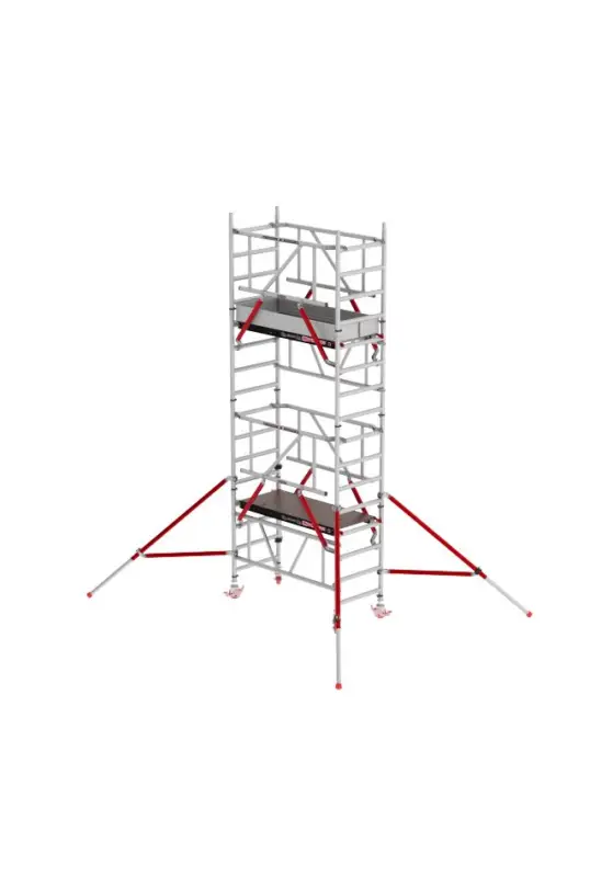 - Dubbele leuningschoren, een handig klauwsysteem en dubbelgeremde wielen maken de rolsteiger tot de meest stabiele in zijn soort.