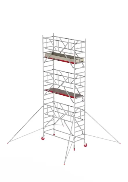 - Met smalle frames van 0,75 of 0,90 meter en een belasting tot 250 kg per platform is deze rolsteiger geschikt om in smalle ruimtes te plaatsen.